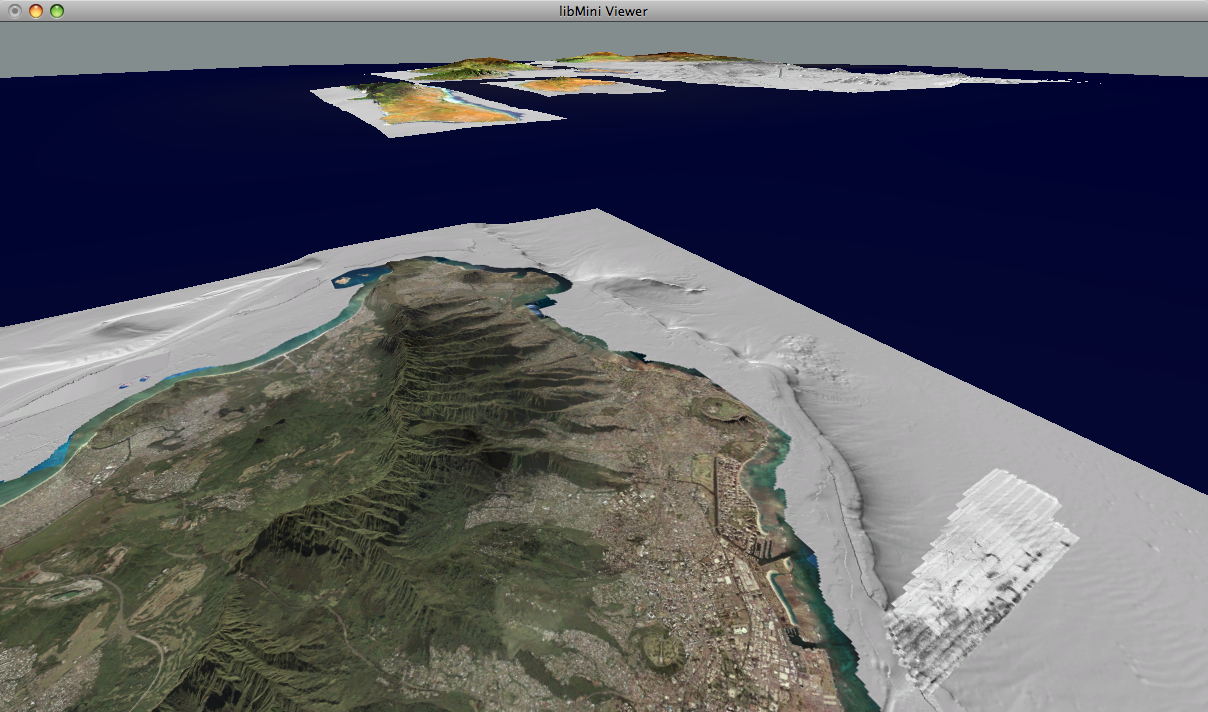 The Oahu Demo uses the libMini async tile cache to page the 70 GB of original Oahu data in real-time. The entire island is covered with less than 0.5m for the aerials and 5-10m for the terrain. Due to the immense size of the data, the demo is only available as a tileset tarball (5GB).